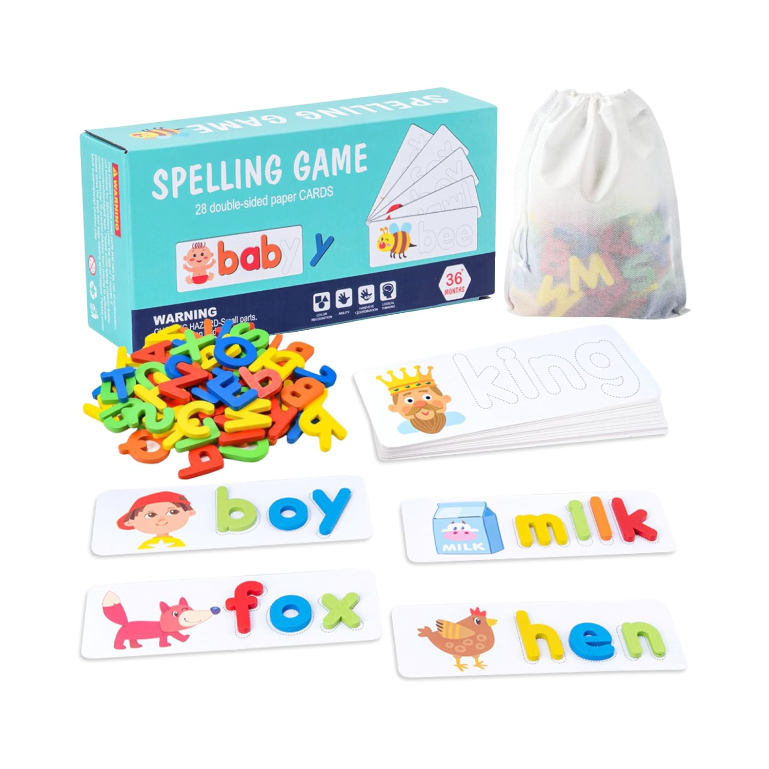 The Montessori Spelling Game comes with a portable, kid-friendly storage bag along with 52 high-quality wooden letters that are perfectly sized for small hands to pick up and place. The set also includes 28 double-sided activity cards, each with a bright picture and dotted letter outlines that guide children as they build the correct spelling using the wooden letters. Everything fits neatly inside the bag, making learning organized, simple, and travel-ready.